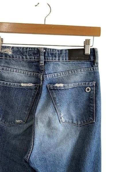 Jean corte mom efecto gastado y roturas, con denim rigido.