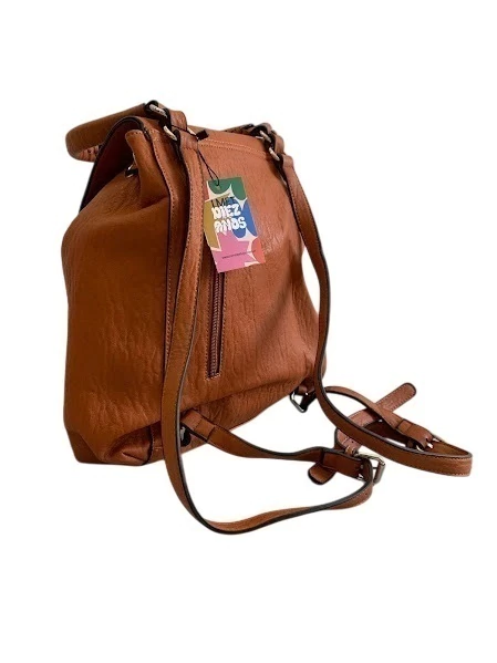 Mochila efecto cuero graneado, cerraje de tiras, y 3 bolsillos con cierre.